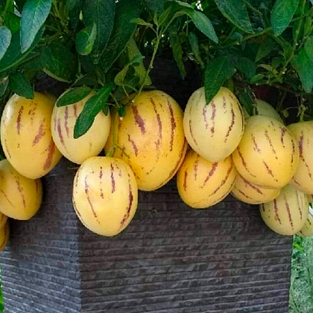 Другое название растения – дынная груша. Интересно своими плодами молочно-белого цвета с контрастными сиреневыми полосками. Мякоть плодов сочная, кисло-сладкая, с сильным ароматом дыни и фруктовым привкусом. Едят их свежими, добавляют в салаты, сушат или консервируют. В холоде плоды хранятся до 2,5 месяцев. Вечнозеленое многолетнее растение, может выращиваться в теплицах, а на зиму его переносят в теплое место. Уход такой же, как за томатами или баклажанам.