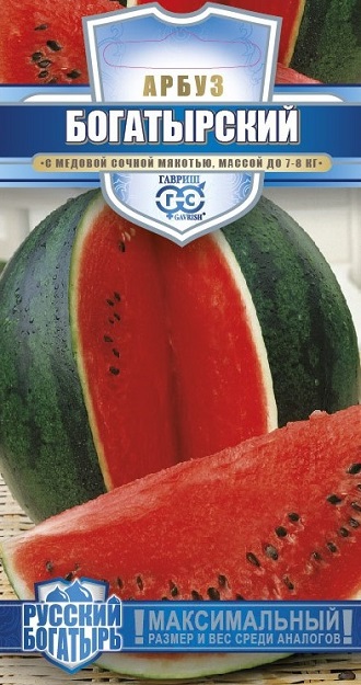 Среднепоздний (90-95 дней от всходов до первого сбора плодов) сорт для выращивания в открытом грунте (южные регионы) и пленочных теплицах. Сочетает превосходное качество крупных плодов с высокой урожайностью даже в неблагоприятное лето. Растение мощное, плетистое, главная плеть более 5 м. Плод удлиненно-шаровидный, с рисунком из темно-зеленых, почти черных шиповатых полос, средняя масса — 5,2 кг (при хорошем уходе до 7-8 кг). Кора тонкая, кожистая. Мякоть ярко-красная, мелкозернистая, медовая, сочная, с насыщенным арбузным ароматом. Сорт устойчив к основным заболеваниям, плоды хорошо хранятся (3 месяца после съема плодов). Посев на рассаду производят в конце апреля. Высадку рассады — в конце мая – начале июня. Растения подвязывают к шпалере, до высоты 50 см удаляют все боковые побеги, последующие прищипывают над 1-3 листом. Возможно выращивание в свободной культуре в расстил. Схема посадки 70х150 см. Полив умеренный, особенно в период созревания плодов.