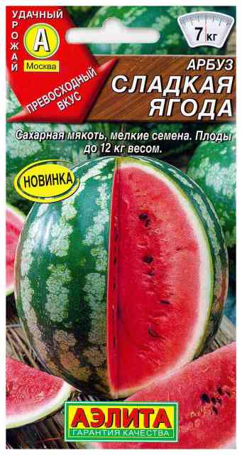 Очень вкусный высокоурожайный среднеранний сорт. Первые плоды созревают спустя 62-72 дня после появления всходов. В средней полосе желательно выращивать под пленочными укрытиями, в южных регионах – в открытом грунте. Плоды округлые, массой 5-7 кг (при хорошей агротехнике вырастают до 12 кг) с сочной сладкой темно-красной мякотью, отличного вкуса и очень мелкими семенами. Содержание сухого вещества 8,1-10,3%, общего сахара 6,1-8,9%. В зоне рискованного земледелия лучше выращивать на «теплой» грядке. После съема плоды хранятся в течение 20 дней, не теряя вкусовых качеств. Не растрескиваются при транспортировке.
