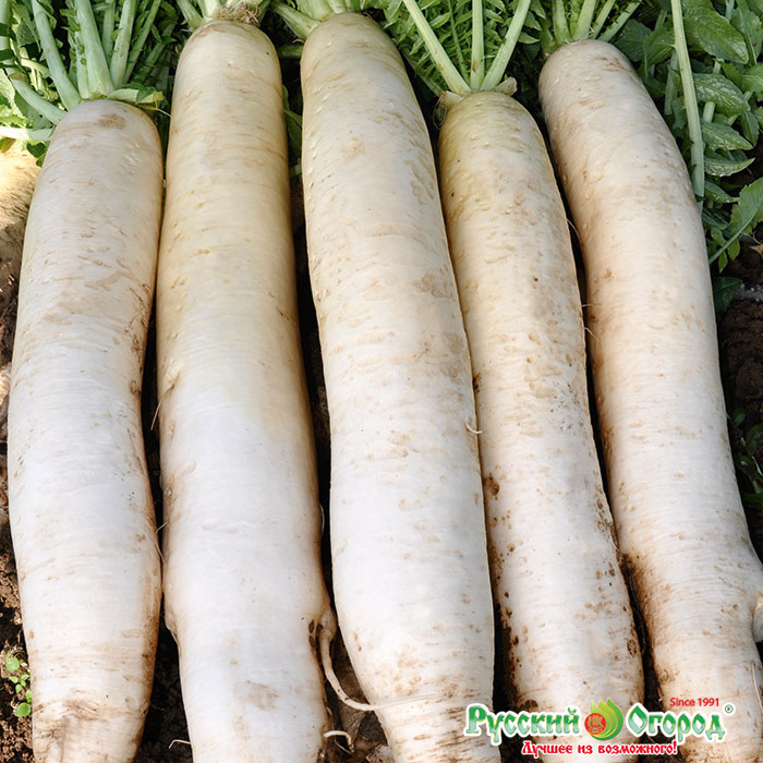 Дайкон Большая Удача F1 – белоснежный японский шедевр на вашей грядке! Сорт среднеспелый, корнеплоды средней длины 40 см и массой 2,6 кг. Над почвой выступает на 1/7 длины. Поверхность чисто белая, гладкая. Мякоть сочная и очень нежная. Вкус средне-сладкий, слабо острый. За дайконом не требуется активно ухаживать, достаточно пропалывать посадки, аккуратно рыхлить почву и поливать по мере подсыхания почвы. Одним словом, попробовать столь универсальный и приятный корнеплод – действительно настоящая удача, которой будут завидовать друзья и соседи!