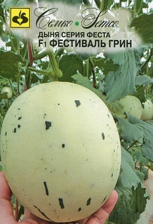 среднеспелый гибрид сортотипа Феста для открытого и защищенного грунта. От высадки 25-дневной рассады до первого сбора плодов 70-75 дней, или 45-50 дней от момента опыления. Растение среднеплетистое, мощное, лист небольшой, зелёный, на одной плети 1-2 дыни. Плоды округло-овальные, гладкие, без сетки, с чётко выраженными тёмно-зелёными пятнами на светло-зелёной коре, массой 1,6-1,8 кг. Мякоть светло-зелёная, нежная, сочная, ароматичность средняя, вкус отличный. Гибрид дыни Фестиваль Грин F1 устойчив к фузариозу (Fom) и мучнистой росе (Px). Кора плотная. Рекомендуется для выращивания в теплицах с расстоянием между растениями 40 см с подвязкой к опоре. Растение формируют в один стебель, удаляя все пасынки до боковой плети с женским цветком (11-12 лист), которую прищипывают, оставляя 2-3 листа после цветка. После этой боковой плети с завязью, главный стебель прищипывают над 26 листом или на уровне шпалеры, удаляя все пасынки, и оставляя 1-2 боковых побега у верхушки.