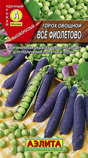 Уникальный сорт с фиолетовой окраской лопаток. Необычный цвет обусловлен высоким уровнем антоцианов. Сорт среднеспелый, урожай начинают собирать на 55-60 день от всходов. Длина стеблей достигает 1,5-1,8 м. Ароматные, фиолетовые цветки и бобы-лопатки (длиной 9-10 см) очень декоративны во время цветения и плодоношения. Молодые бобы подходят для употребления в пищу целиком, так как почти лишены пергаментного слоя. Горошек в технической спелости очень нежный, богат сахарами. Урожайность зеленого горошка 0,6-0,9 кг/м2.
