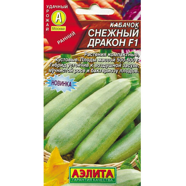 Ранний гибрид, плодоносит на 38-42 день от всходов. И зеленцы, и зрелые плоды имеют наиболее светлую окраску среди всех кабачков. Плоды массой 500-600 г. Мякоть белая, плотная, содержит 5-6% сухих веществ, 2,5-3% сахаров, 20-25 мг% витамина С. Рекомендуется для столовых целей и консервирования. Вкус продукции отличный. Урожайность 5-6 кг/м2.