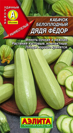 Скороспелый белоплодный сорт. От всходов до первого сбора плодов около 45 дней. Растения кустовые, компактные, с укороченными междоузлиями. Облиственность слабая, склонности к загущению нет. Плоды массой 0,8-1,2 кг, хорошо хранятся и транспортируются. Мякоть светлая, нежная, в меру плотная. Рекомендуется для столовых целей и консервирования. Вкус в приготовленном виде превосходный. Урожайность 8-10 кг/м2.