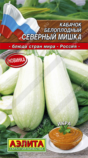 Раннеспелый, неприхотливый, высокоурожайный белоплодный сорт. Отлично растет и плодоносит даже на затененных участках. От всходов до первого сбора плодов 43-50 дней. Растения кустовые, слабоветвистые. Плоды среднего размера, гладкие, массой 0,8-1,5 кг. Мякоть достаточно плотная, белая, отличного вкуса, может использоваться в свежем виде для витаминных салатов. Один из лучших сортов для консервирования и приготовления икры. Устойчив к мучнистой росе и прикорневым гнилям. Урожайность – до 8 кг/м2.