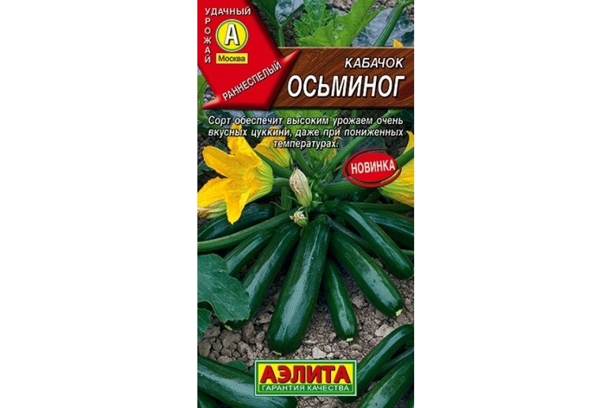 Раннеспелый высокоурожайный сорт цуккини. От всходов до начала сбора товарных плодов проходит 40-45 дней. Рекомендуется для выращивания в открытом грунте. Растение кустовое, с малым количеством листвы, компактное. Плод цилиндрический, массой до 1 кг. Вкус сладкий и нежный. Мякоть плотная, почти без семян, поэтому сорт пригоден для приготовления любых блюд и заготовок. Цуккини Осьминог устойчив к пониженным температурам и мучнистой росе. Урожайность – до 10 кг/м2.