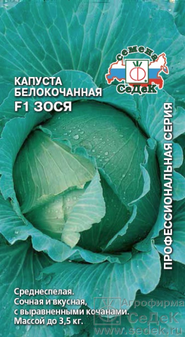 Среднеспелый (125-150 дней) высокоурожайный гибрид. Розетка листьев приподнятая, до 65-75 см в диаметре, листья с сизым налетом. Кочан компактный, плотный, плоскоокруглый, массой 3-3,5 кг, с отличной внутренней структурой, сахаристый, сочный. Внешняя и внутренняя кочерыги короткие. Вкусовые качества очень высокие. Ценность гибрида: устойчивость к растрескиванию и фузариозному увяданию, гарантированная дружная урожайность, высокий выход выравненных кочанов. Используется для всех видов кулинарной переработки и продолжительного хранения.