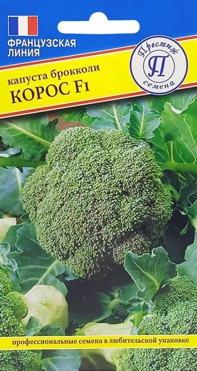 Срок созревания - 55 дней. Растение формирует округлые головки зеленого цвета в мелкую бусинку. Плод тяжелый, имеющий правильную короновидную форму. На головке не растут листочки, а в ножке не образовывается пустота. Плод созревает концентрировано, выровненность высокая. Сочетание раннеспелости, качества и продуктивности делают семена капусты брокколи Корос F1 очень популярными среди покупателей.