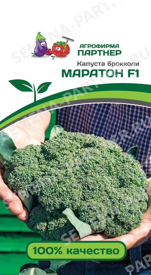 Гибрид среднеспелый. От высадки 25-дневной рассады до первого сбора плодов 75-80 дней. Головки плотные, массой до 1 кг, поверхность кочана сглажена. После удаления центрального кочана через 2-3 недели отрастают боковые головки массой 100-150 г. Маратон F1 - мировой стандарт и эталон для гибридов брокколи. Рекомендуется для свежего потребления, замораживания и любых видов домашней и промышленной переработки. Благодаря хорошей адаптации к различным условиям выращивания, способна давать высокий урожай качественных головок. Не рекомендуется для зон с высокими температурами. Плотность посадки 5-6 растений/м2. Урожайность 5-7 кг/м2.