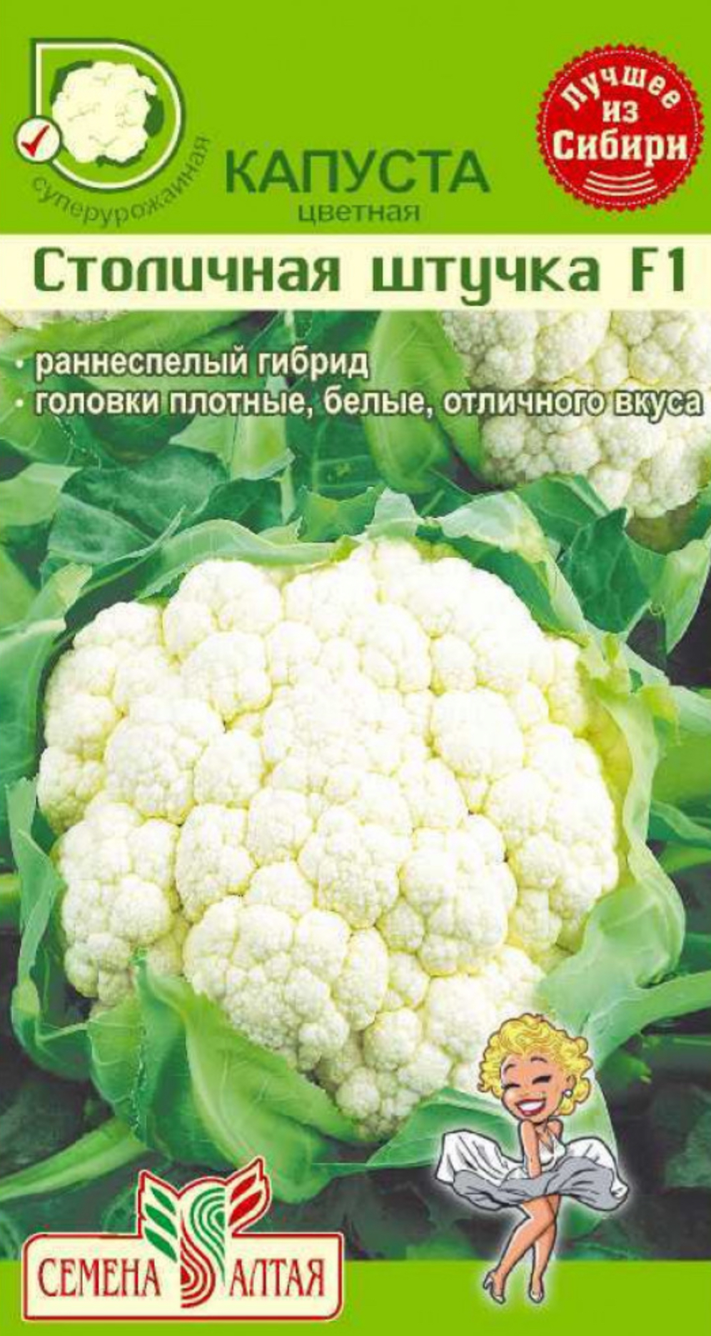 Гибрид-новинка, ранний деликатес с грядки или парника, созревает на 60-65 день после высадки рассады при выращивании летом, 70 дней- весной. Головка округлая, плотная, гладкая, массой до 0,9-1,1 кг., ровной молочно-белой окраски благодаря хорошему покрытию широких листьев. Обладает превосходным вкусом, используется в кулинарии и консервировании, можно замораживать. Рекомендован в качестве рыночной продукции.