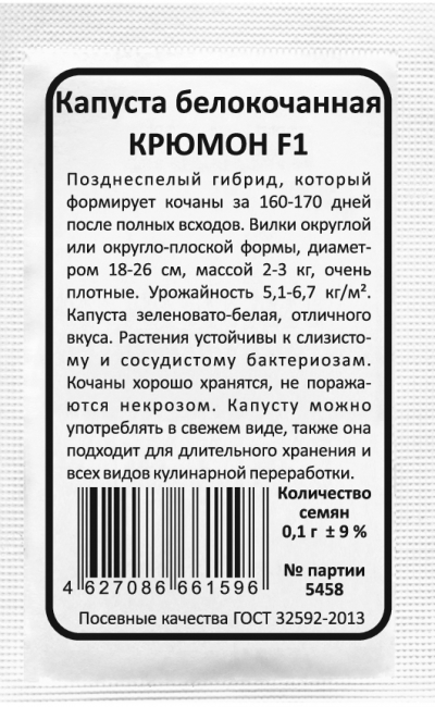 Позднеспелый гибрид, который формирует кочаны за 160-170 дней после полных всходов. Вилки округлой или округло-плоской формы, диаметром 18-26 см, массой 2-3 кг, очень плотные. Урожайность 5,1-6,7 кг/м². Капуста зеленовато-белая, отличного вкуса. Растения устойчивы к слизистому и сосудистому бактериозам. Кочаны хорошо хранятся, не поражаются некрозом.