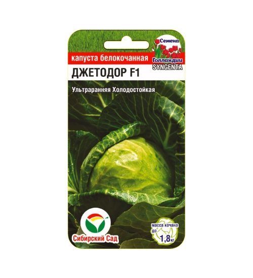 Джетодор F1- гибрид суперранней (48-50 дней от высадки рассады) белокочанной капусты устойчивой к фузариозу и мучнистой росе. Без проблем переносит понижение температуры. Выращивается в пленочных теплицах, в поле под укрытием и без. Дружное созревание и возможность к непродолжительного хранения «на корню».