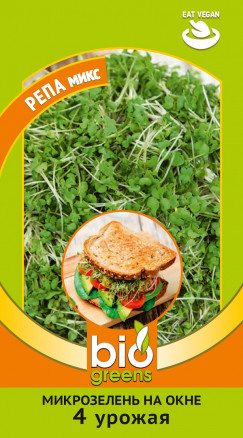 Нежная и сочная Микрозелень репы прекрасно сочетается в салатах с овощами, фруктами, мясными и рыбными блюдами, схожа по вкусу со вкусом капусты. Быстро развивающиеся молодые ростки содержат много полезных свойств, витамины (А, С, К, В6), микроэлементы (калий, магний, марганец, сера), клетчатка, эфирные масла, фолиевую кислоту, глюкорафаин, лизоцим. Обладают антибактериальными, противовоспалительными свойствами, выводят из организма токсины и шлаки, усиливают обменные процессы в организме, укрепляют иммунитет, благотворно влияют на состояние кожи. В состав входят следующие сорта: Гейша, Голден бол.