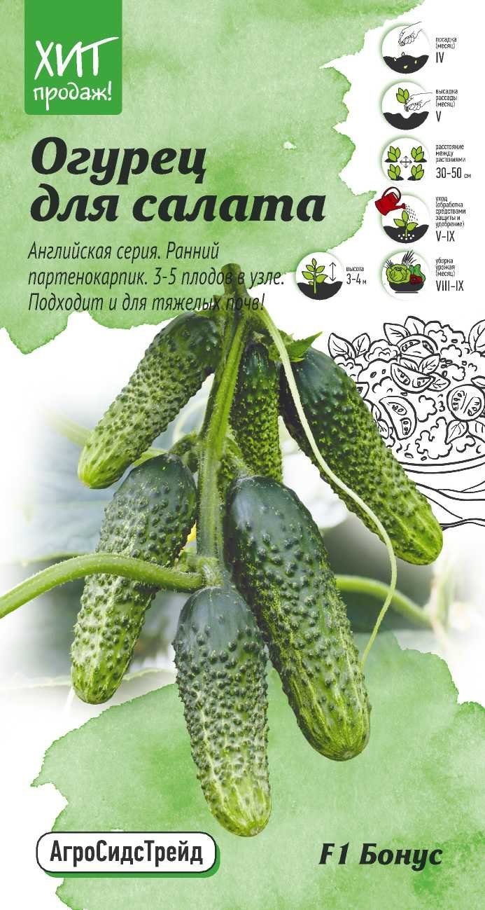 Ранний партенокарпический гибрид для защищенного грунта, от всходов до начала плодоношения 39-43 дня. Растение мощное, слабоветвистое, женского типа цветения, в узле по 3-5 завязей. Плод цилиндрический, длиной 12-14 см, диаметром 3,5-4 см, массой 120-150 г, интенсивно зеленой окраски. Поверхность плода крупнобугорчатая, опушение белое. Мякоть плотная, хрустящая, ароматная, без горечи. Вкусовые качества отличные. Урожайность - до 9 кг/м2. Плоды после сбора долго не подвядают, хорошо выдерживают длительную транспортировку. Гибрид обладает комплексной устойчивостью к заболеваниям. Салатного назначения. Рекомендован для выращивания в весеннем и летне-осеннем обороте обогреваемых и необогреваемых пленочных теплиц.