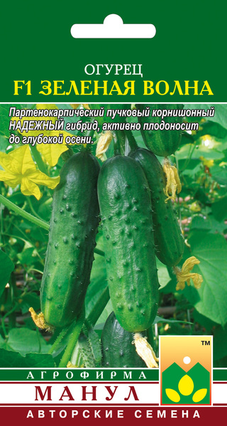 Огурец F1 Зеленая волна - партенокарпический высокоурожайный скороспелый пучковый корнишонный гибрид для открытого грунта, весенних теплиц, временных пленочных укрытий. НАДЕЖНЫЙ ГИБРИД — благодаря комплексной устойчивости к болезням и неблагоприятным условиям среды дает стабильно высокий урожай в любых условиях. Холодостойкий, ветвление хорошее (II тип саморегулирования ветвления), период плодоношения длительный. В узлах формируется от 2-3 до 5-7 завязей. Зеленцы ярко-зеленой окраски, бугорчатые, белошипые, длиной 9-12 см; частота расположения бугорков средняя. Мякоть плотная, хрустящая, засолочные и вкусовые качества высокие. Теневынослив. Гибрид устойчив к мучнистой росе, оливковой пятнистости, вирусу обыкновенной огуречной мозаики, толерантен к ложной мучнистой росе, корневым гнилям.