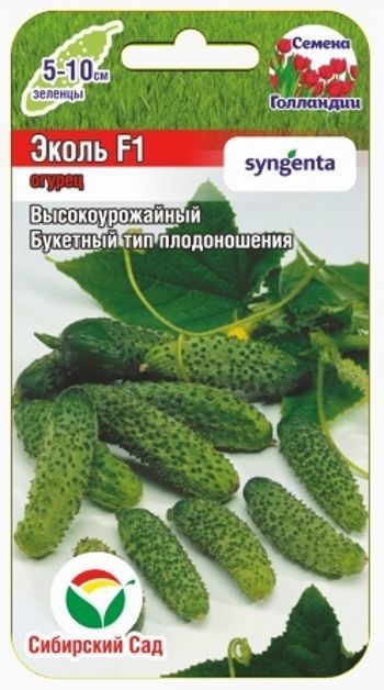 Темно-зеленые, белошипые сладкие, зеленцы гибрида Эколь F1 хороши в свежем виде, по особому вкусны в засоле и при мариновании. Гибрид устойчив к кладоспориозу и мучнистой росе, относительно устойчив к рикусу огуречной мозайки.