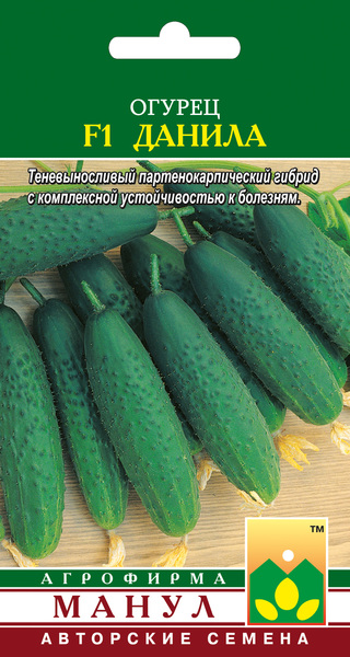 Огурец F1 Данила - урожайный партенокарпический гибрид женского типа цветения для тоннелей, весенних теплиц, открытого грунта, а также для летне-осеннего оборота. Выделяется интенсивным плодообразованием и одновременным наливом большого количества зеленцов на растении. Стартовая партенокарпия высокая. В узлах формируется по 2 завязи. В плодоношение вступает на 40-42 день от всходов. Ветвление среднее. Зеленцы ровные, хорошо держат форму, темно-зеленой окраски, крупнобугорчатые, белошипые, с частым опушением, длиной 12-15 см; засолочные и вкусовые качества высокие. Гибрид характеризуется повышенной теневыносливостью, устойчив к мучнистой росе, оливковой пятнистости, вирусу обыкновенной огуречной мозаики, толерантен к ложной мучнистой росе, корневым гнилям.