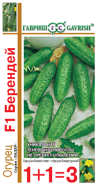 Скороспелый (45-50 дней от всходов до плодоношения) партенокарпический гибрид женского типа цветения для выращивания в пленочных теплицах. В пазухе листа образуется по 4 завязи. Зеленец небольшой, с плотной мякотью и нежной кожицей, длиной 12-14 см, массой 120-130 г, частобугорчатый, белошипый, без горечи. Окраска плодов темно-зеленая, с короткими светлыми полосами. Использование плодов универсальное (засолка, маринование, приготовление свежих салатов). Гибрид устойчив к настоящей мучнистой росе и корневым гнилям. Обладает уникальной теневыносливостью, прекрасно подходит для выращивания на подоконнике, балконе, лоджии. С одного растения можно получить ведро (около 8 кг!) великолепных хрустящих огурчиков.