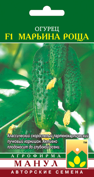 Огурец F1 Марьина роща - высокопродуктивный скороспелый партенокарпический пучковый корнишонный гибрид женского типа цветения для открытого и защищенного грунта. Характеризуется стабильно высоким урожаем в любых условиях, плодоносит до глубокой осени. Растения сильнорослые, с хорошим отрастанием боковых побегов, холодостойкие. В узлах формируется от 2-3 до 4-5 завязей. Теневынослив. Благодаря высокой партенокарпии и сильному проявлению гетерозиса на каждом растении может одновременно наливаться до 10-12 плодов! Зеленцы интенсивно-зеленой окраски, бугорчатые, белошипые, длиной 10-12 см, плотные, хрустящие, ароматные. Бугорки крупные, расположение бугорков средне-частое. Засолочные и вкусовые качества очень высокие. Гибрид устойчив к мучнистой росе, оливковой пятнистости, вирусу обыкновенной огуречной мозаики, толерантен к ложной мучнистой росе, корневым гнилям.