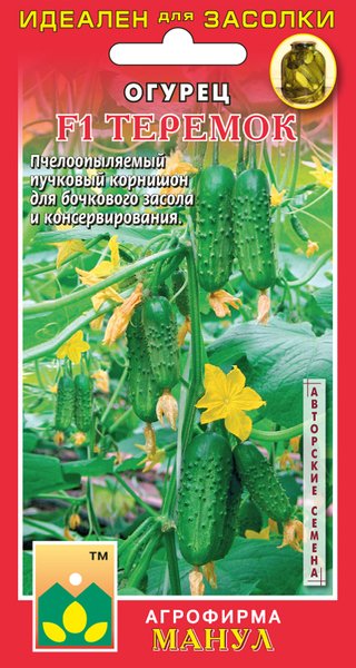 F1 Теремок - высокоурожайный пчелоопыляемый пучковый гибрид корнишонного типа для открытого и защищенного грунта. Растения женского типа цветения, ветвление среднее или ниже среднего. Зеленцы бугорчатые, черношипые, длиной 8-12 см, очень высоких засолочных и вкусовых качеств. В узлах формируется от 3-4 до 6-9 завязей. Создан для бочкового засола, а также для консервирования мини-огурцов в банках. Устойчив к оливковой пятнистости, вирусу обыкновенной огуречной мозаики, мучнистой росе, толерантен к ложной мучнистой росе. К гибриду подсевают 10 % опылителя.