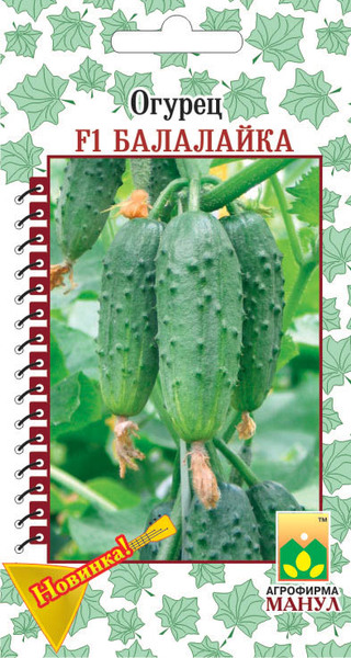Огурец F1 Балалайка - уникальный партенокарпический пучковый корнишонный гибрид для защищенного и открытого грунта, сочетающий в себе скороспелость, стабильно высокую урожайность (плодоносит в любых температурных условиях), ограниченное ветвление и красивые зеленцы, похожие на старинные русские огурцы. Растения преимущественно женского типа цветения. В условиях почвенной засухи и сильной жары количество мужских узлов может возрастать; при пониженной температуре воздуха мужских узлов практически не бывает. Наличие нескольких мужских узлов не является отрицательным признаком — наоборот, это способствует «разгрузке» растений и активному наливу завязей при большом количестве сформированных зеленцов на растении. Гибрид светолюбивый. Ветвление очень слабое, боковых побегов практически нет (вместо них — очень короткие детерминантные букетные веточки). Основная плеть при высокой нагрузке плодами имеет тенденцию к детерминации.