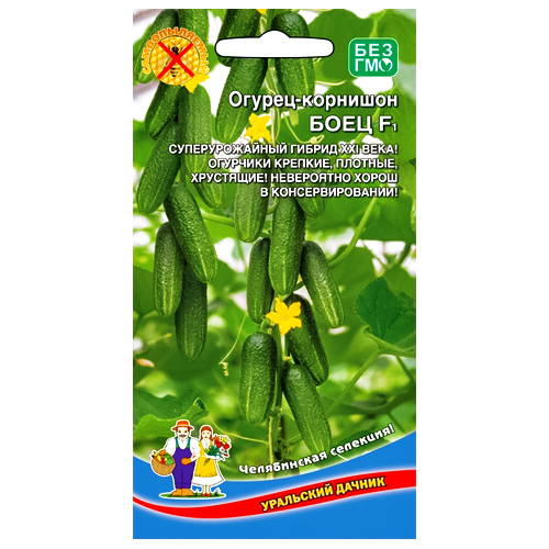 Гибрид среднеспелый, от всходов до плодоношения – 46-53 дня. Растение сильнорослое, женского типа цветения. Плоды – генетически без горечи, цилиндрической формы, массой 50-90 г, длиной 6-9 см, зелёные и тёмно-зелёные, с короткими и средней длины продольными полосами, пятнистостью и ребристостью. Если Бойца F1 вовремя «кормить» и уделять ему внимание, урожайность может быть 10-12 кг с 1 м2. Вкусовые качества свежих и консервированных корнишонов прекрасные. Бойцу F1 никакой «враг» не страшен, он стойко противостоит распространённым болезням огурца.