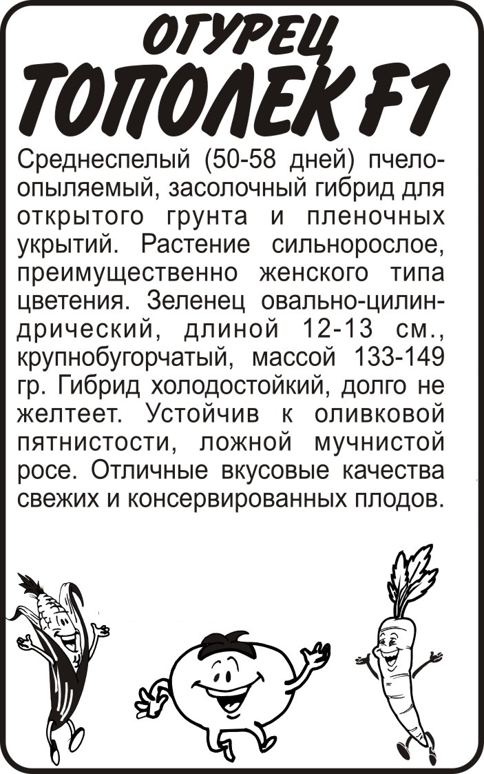 Среднеспелый (50-58 дней) пчелоопыляемый, засолочный гибрид для открытого грунта и пленочный укрытий. Растение сильнорослое, преимущественно женского типа цветения. Зеленец овально-цилиндрический, длиной 12-13 см, крупнобугорчатый, массой 133-149 г. Гибрид холодостойкий, долго не желтеет. Устойчив к оливковой пятнистости, ложной мучнистой росе. Отличные вкусовые качества свежих и консервированных плодов. Выращивают прямым посевом семян в грунт и рассадным способом. Семена в открытый грунт высевают, когда почва прогреется до 15-20°С днем и не ниже 8°С ночью. Бороздки или лунки поливают, заделывают в них семена на глубину 1,5-2,0 см и накрывают пленкой. В остекленные или пленочные теплицы, тоннели с начала мая высевают семена или с середины мая высаживают 20-25-дневную рассаду, имеющую 3-5 настоящих листьев. Схема посадки 70х40 см. Растение прищипывают над 5-7 листом. Плоды формируются на боковых побегах.