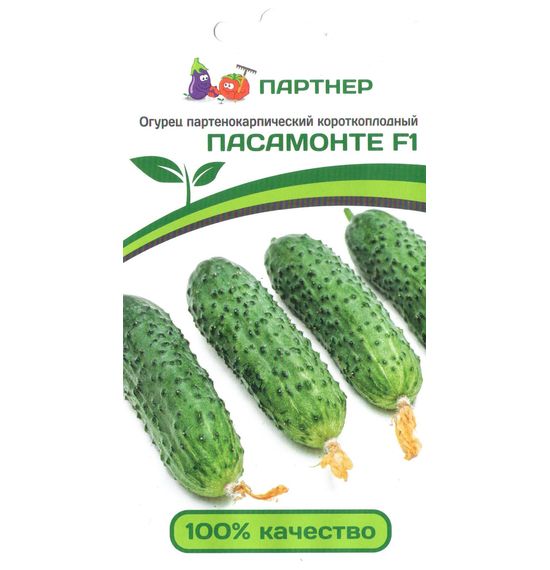 Гибрид Пасамонте среднеспелый. От всходов до начала плодоношения 43-45 дней. Плод генетически без горечи, цилиндрический, длиной 6-9 см, крупнобугорчатый, белошипый, зеленый с продольными полосами средней длины и средневыраженной пятнистостью, не перерастает. В одном узле формирует 2-3 плода. Вкусовые качества свежих и консервированных плодов отличные. Пригоден для засола и консервирования. Пасамонте F1 устойчив к кладоспориозу и мучнистой росе, относительно устойчив к вирусу огуречной мозаики-1. Урожайность 12-15 кг/кв.м.