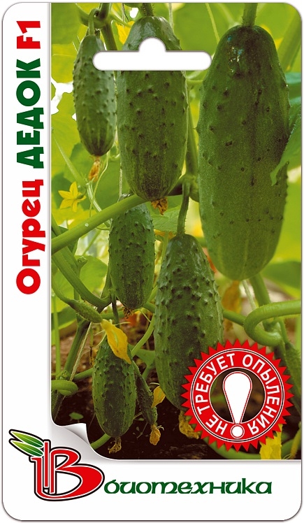 Гибрид Дедок F1, среднеспелый (48-50 дней от посева до первых сборов), 100% партенокарпический. Завязь букетная – в пазухе 2-4 завязей. Зеленец длиной 10-12 см, цилиндрической формы, крупнобугорчатый, зеленый со светлыми полосами доходящими до 1/3 плода. Консистенция мякоти плотная, хрустящая.
