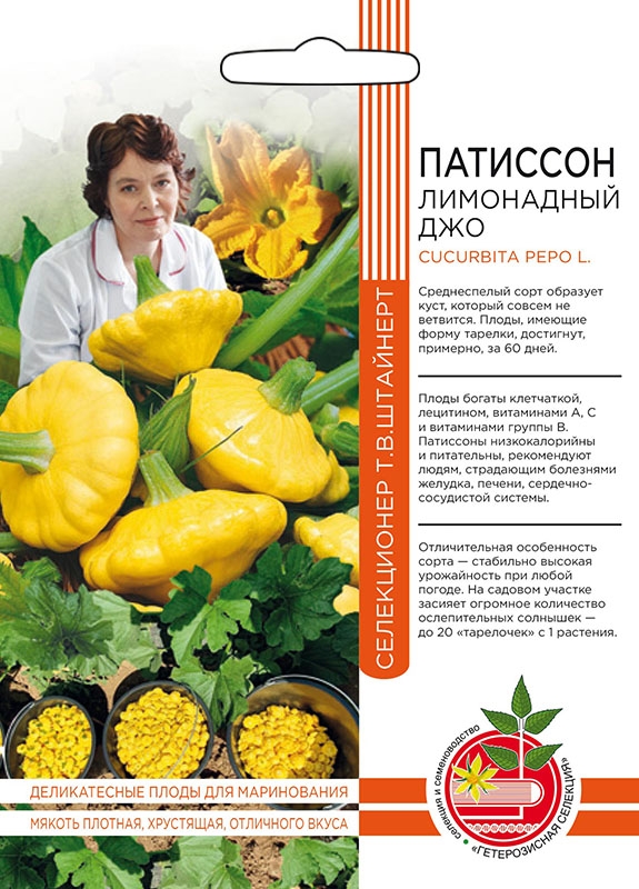 Среднеспелый сорт образует куст, который не ветвится. Технической зрелости плоды, имеющие форму тарелки, достигнут, примерно, за 60 дней от периода прорастания сеянцев. В этой фазе патиссоны ярко-жёлтого цвета. При достижении биологической спелости окрас поменяется на оранжевый. Плоды у Джо в среднем вырастают до 250–300 г. Они слабо сегментированные, правильно-выровненные, с неглубокими фестонами и кремоватой мякотью, которая богата каротином, витаминами группы В и РР, клетчаткой, кальцием, калием, фосфором и железом. Именно за счет содержащихся в плодах «здоровых» веществ патиссон относится к группе продуктов рекомендованных для детского и диетического питания.