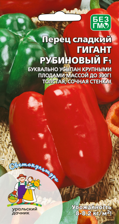 Раннеспелый гибрид для выращивания в открытом грунте, парниках и в теплицах. Период от полных всходов до технической спелости 95-110 дней. Растение детерминантное, высотой до 1 метра, буквально усыпано плодами средней массой 140-160г, отдельные плоды-гиганты до 300 г. Плод висячий, кубовидной формы, гладкий, глянцевый, в биологической спелости рубиново-красного цвета. Один из самых толстостенных среди гибридов сладкого перца. Толщина стенки на отдельным плодах может достигать более 1 см. Вкусовые качества свежих плодов хорошие и отличные. Аромат сильный. В плодах в технической спелости содержится: сухого вещества 7,1%, общего сахара 2,5%, аскорбиновой кислоты 52,5 мг на 100 г.