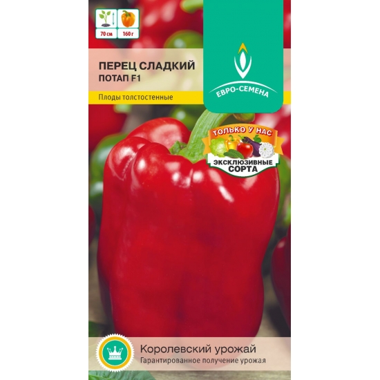 Великолепный раннеспелый гибрид для выращивания в открытом грунте и пленочных укрытиях. Растение полуштамбовое, средней высоты. Образует крупные, красные, кубовидные, глянцевые плоды, массой до 150-170 г с толщиной стенки 7-8 мм. Вкусовые качества отличные. Нежная кожица, великолепный вкус, аромат и оригинальная окраска плодов делают гибрид Потап идеальным для употребления в свежем виде и консервирования и приготовления домашнего лечо. Отличается высокой урожайностью.