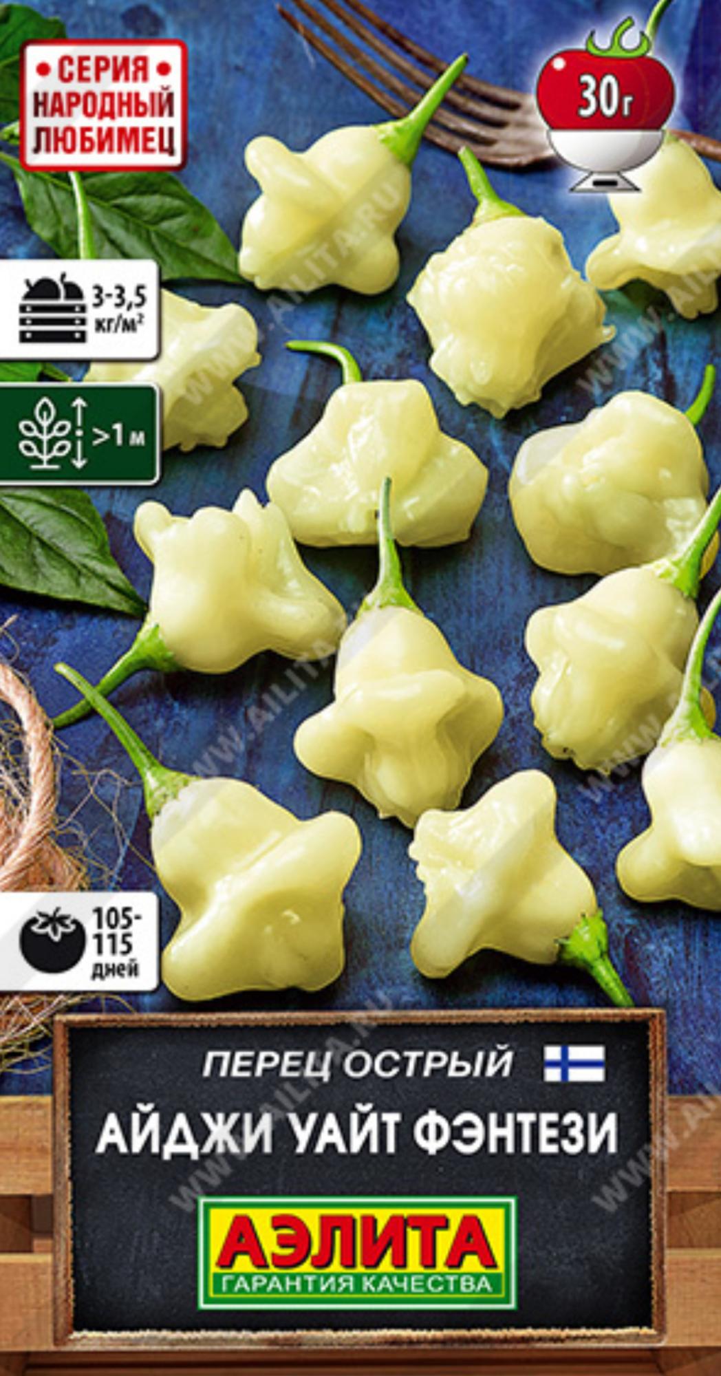 Знаменитый современный сорт из Финляндии, уже полюбившийся ценителям острого перца по всему миру. Известен гурманам как "Aji Fantasy Sparkly White", степень остроты 4 балла из 10 по шкале Сковилла. По сравнению со своим прародителем – желтым перцем-чили "Aji Fantasy", отличается фантастической продуктивностью (до 100 перчиков c куста!), более толстой (3-4 мм) и сочной мякотью, сбалансированной "мягкой" остротой (семена очень острые), сладковатым вкусом и фруктовым ароматом. Куст раскидистый, крепкий, высотой в теплице более 1 м. Плоды массой 25-30 г созревают рано, через 105-115 дней от всходов. Очень полезны для здоровья, их следует употреблять в свежем виде, мариновать и сушить впрок.