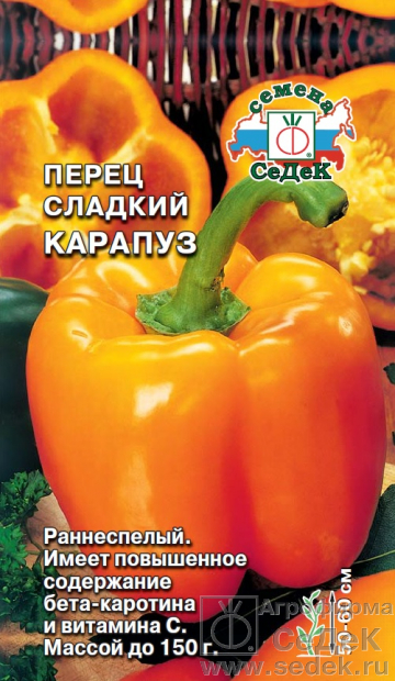 Раннеспелый (95-100 дней) сорт для открытого грунта и пленочных укрытий. Растение полураскидистое, высотой 50-60 см. Плоды крупные, усеченно-конусовидные, сильноглянцевые, в технической спелости темно-зеленые, в биологической – темно-оранжевые, массой 120-150 г, толщина стенки 6-7 мм, со слабым перечным ароматом. Вкусовые качества хорошие. Ценность сорта: обладает комплексной устойчивостью к болезням, крупноплодность, высокая урожайность и товарность, имеет повышенное содержание каротина и витамина С. Назначение универсальное.