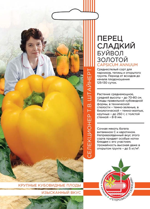 Новый, суперурожайный, среднеспелый сорт уральской селекции. Вкус у плодов, имеющих кубовидную форму и тёмно-жёлтую окраску, восхитительный. Ароматная мякоть, толщина которой 8-9 мм, буквально переполнена соком, вкус — с фруктово-перечными нотками, поэтому свежие салаты и другие блюда всегда получаются пикантными. Растение средней высоты, до 75 см, с некрупными листьями, а вот плоды — настоящие буйволы. Средняя масса перца 150-200 г, но нередки экземпляры и покрупнее — до 250 г.