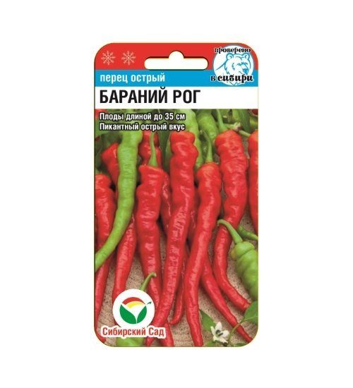 Плоды длиной до 35 см, Пикантный острый вкус. Высота куста в открытом грунте – 50-60см, в пленочных укрытиях до 1 м. Куст сомкнутый, не требует формирования. Плоды пониклые, узкоконусовидные, очень длинные (20-35 см), слабоморщинистые, скручены по спирали и похожи на бараний рог. Диаметр плодов 1-1,5см, масса 30-36г. Окраска зеленая в технической спелости, в биологической – красная. Перцы имеют пикантный острый вкус и сильный аромат. Рекомендуется для использования в виде приправы к блюдам, в качестве специй при квашении, мариновании и консервации.