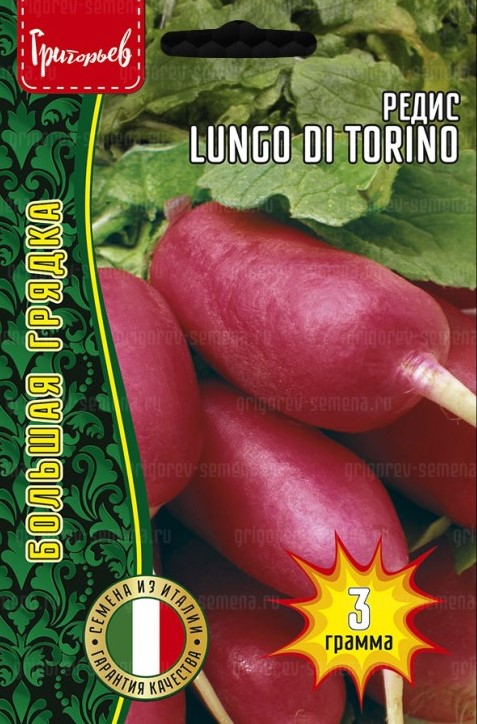 Высокоурожайный, среднеспелый сорт полученный итальянским фермером в результате скрещивания двух разных сортов редиса, а именно Раванелло Торино и Раванелло олива из Лигурии. От всходов до технической спелости проходит 25-30 дней. Корнеплоды массой 20-25 г, не растрескиваются. Мякоть плотная, хрустящая, сочная, приятного слабоострого вкуса. Рекомендуется для потребления в свежем виде и непродолжительного хранения. Сорт устойчив к дряблению корнеплодов и цветушности.
