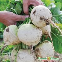Один из самых крупноплодных редисов. Корнеплод, словно маленькая белая репка, округлый и овальный, диаметром 10 см, массой до 400 г! Мякоть белая, сочная, нежная, малоострая. Позднеспелый, период вегетации 30-45 дней. Устойчив к цветушности.