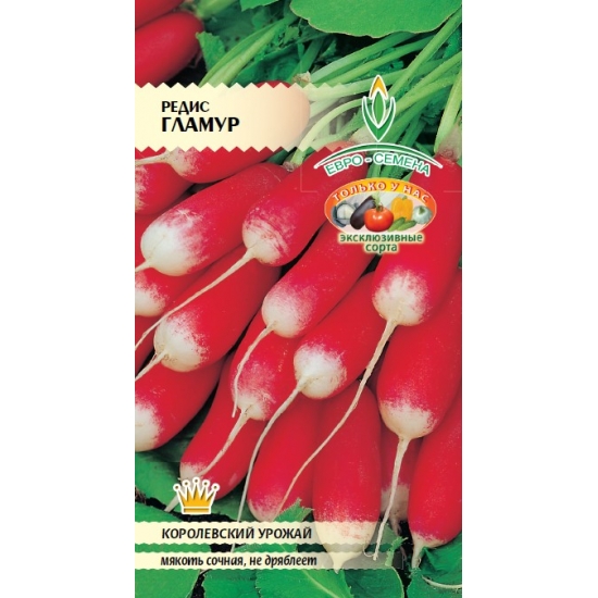 Раннеспелый высокоурожайный сорт, период от всходов до технической спелости 18-22 дня. Пригоден для раннего посева в открытом и закрытом грунте. Корнеплоды цилиндрической формы, длиной 5-6 см, в диаметре - 2 см, с гладкой и ровной поверхностью, ярко-красного цвета и белым кончиком. Мякоть белая, плотная, сочная, без горечи. Сорт отличается дружной отдачей урожая и отличными вкусовыми качествами.