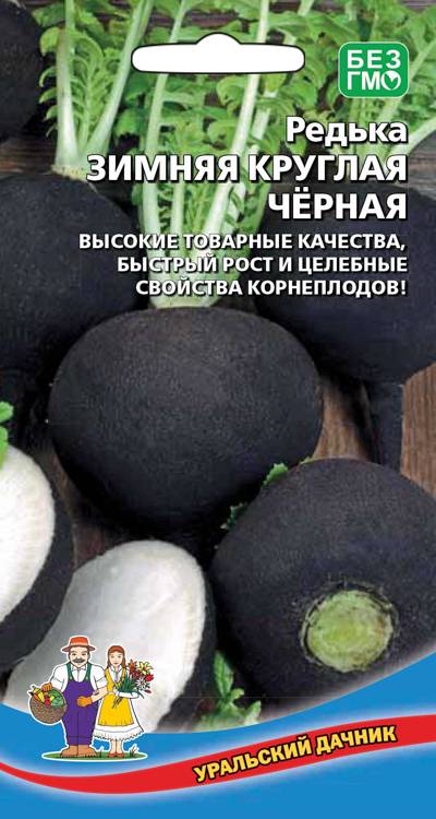 Самый популярный сорт для хранения! Корнеплод плоскоокруглый, чёрный, массой до 550 г, мякоть белая, плотная, сочная, слабоострая.