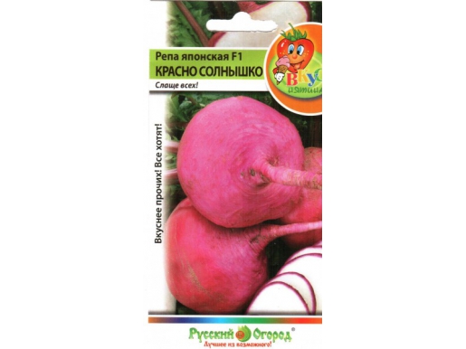 Репа японская славится высоким урожаем и достаточно быстрым созреванием. С момента посева до сбора корнеплодов проходит 50-60 дней. Репа Японская Красно Солнышко F1 –новый сорт с абсолютно несвойственным и уникальным для репы вкусом: он вообще не имеет горечи! Корнеплоды у репы японской слегка приплюснутые, округлые, средних размеров, с красивым малиновым цветом. Вес каждого корнеплода в среднем 200-280 грамм. Мякоть очень белая, с невероятно нежным сладковатым вкусом, как будто её до этого немного проварили. У плодов японской репы всегда повышенное содержание сахара. Репа японская Красно Солнышко F1 потрясающе подходит для вкусных кулинарных блюд. Употреблять эти корнеплоды можно даже в свежем виде, без какой-либо термической обработки! Репа Красно Солнышко F1 отлично подходит для салатов, солений. Она также является диетическим продуктом, в пищу употребляются все части этого полезного растения.