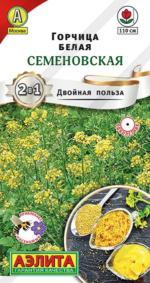 Горчица белая – однолетнее лекарственное растение-медонос. Подходит для выращивания микрозелени, проростки семян также полезны. Молодую зелень используют в свежем виде в салатах при появлении первых пар настоящих листочков. Высота взрослых растений 90-110 см, они устойчивы к полеганию, толерантны к мучнистой росе. Семена созревают через 80-90 дней от всходов. Применяются в кулинарии в приправах и соусах. Белая горчица – отличное растение-компаньон для других культур. Привлекает насекомых-опылителей, отпугивает вредителей, обогащает почву. При заделке в грунт зеленая масса оздоравливает его и улучшает структуру.