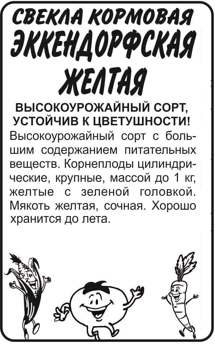 Высокоурожайны сорт с большим содержания питательных веществ. Корнеплоды цилиндрические, крупные, массой до 1 кг, желтые с зеленой головкой. Мякоть желтая, сочная. Хорошо хранится до лета. Светолюбивое, холодостойкое растение. Предпочитает плодородные рыхлые почвы. Кислые почвы необходимо известковать. Лучшие предшественники: томат, перец, огурец, горох, фасоль. Семена высевают в конце апреля — начале мая на глубину 2-4 см. Для получения крупных корнеплодов схема посадки 20х45 см. После появления всходов в фазе одного листа свеклу прореживают. Требуется регулярный, но умеренный полив. Хорошо отзывается на внесение фосфорных и калийных удобрений, чувствительна к недостатку микроэлементов: бора, меди и марганца. Весной под перекопку вносят диаммофоску в количестве 25-30 г/кв.м. В период роста рекомендованы подкормки комплексными минеральными удобрениями. Убирают до наступления первых осенних заморозков. При закладке на хранение корнеплоды пересыпают увлажненным песком.