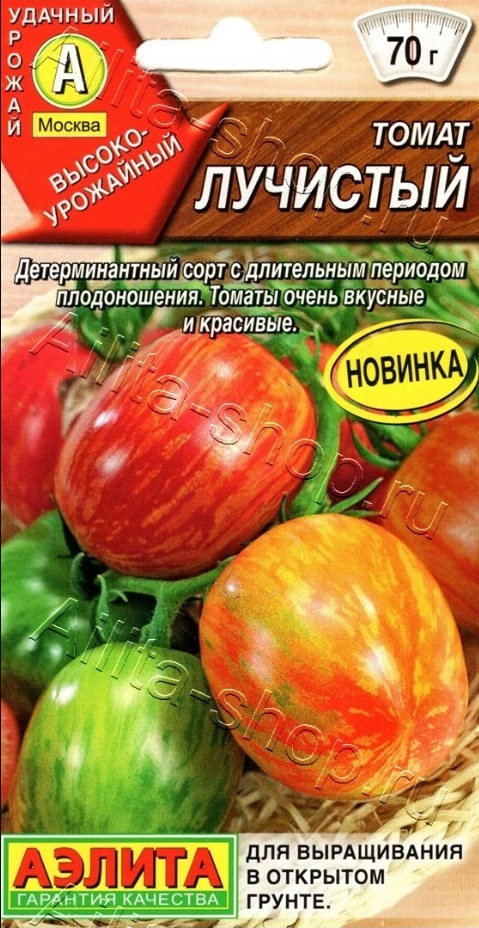Очень красивый детерминантный сорт среднераннего срока созревания и длительным периодом плодоношения. Необычная окраска и вкусовые качества томата не оставят равнодушным ни одного овощевода. Рекомендуется для выращивания в О/Г и под пленочными укрытиями. Первые томаты созревают через 110-115 дней после всходов. Растения среднерослые, высотой 70-80 см (в О/Г), требуют подвязки и формирования. Плоды* гладкие, массой 60-70 г, при созревании приобретают красно-малиновый цвет с золотистозелеными полосками, очень красивые, отличного вкуса. Сорт универсального назначения. Устойчив к растрескиванию. Урожайность 4,5-5,2 кг/ м 2 .