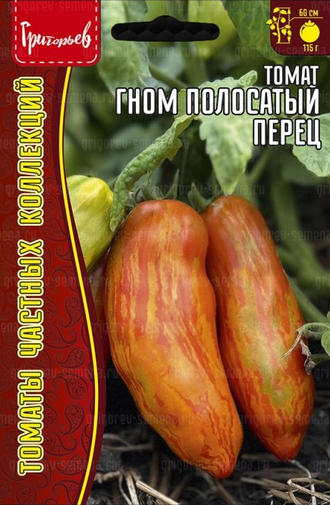 Среднеспелый, низкорослый и очень урожайный сорт. Куст раскидистый, высотой около 50-60 см. Листья простые, слегка гофрированные. Плодоношение продолжительное, длится до самых заморозков. Томаты этого сорта не подвержены болезням, не осыпаются в жару, не трескаются при передержке на кусте. Плоды перцевидной формы, красного цвета с золотистыми полосками. Они плотные, мясистые, с толстыми стенками и малым количеством сока. Вес плодов составляет примерно 80-150 г. Вкус томатов – с лёгкой кислинкой и сладостью. Сорт отлично подходит для вяления и консервации благодаря своим характеристикам.