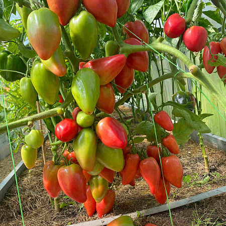 Шикарные грозди спелых розовых перцевидных помидоров типа Корнабель потрясающего десертного вкуса. Гибрид ранний, поспевает одним из первых. Полудетерминантный, а это значит, что его можно формировать в 2–3 стебля, тем самым колоссально повышая урожайность. Куст энергичный с короткими междоузлиями. Активно завязывает плоды. Урожайность очень высокая. Генетически устойчив к вертициллезному увяданию и высокоустойчив к другим заболеваниям.