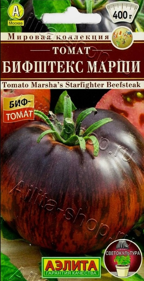 Второе название знаменитого томата: Звёздный истребитель Бифштекс Марши, представитель знаменитого проекта «Звёздные войны» (Star Wars). Крупноплодный салатный сорт биф-томата селекционера Марши Айзенберг (США) привлекает к себе внимание очень красивыми и вкусными плодами. Рекомендуется выращивать в теплицах и в открытом грунте. Среднеспелый, от всходов до созревания первого урожая 110-115 дней. Растения индетерминантные, в О/Г до 1,5 м, в теплице более 2 м. Плоды плоскоокруглые, с экстравагантно-пёстрой окраской: от розово-малинового до вишнёвого и необычного переплетения бордовых и зеленых полос, с антоцианом на плечиках, массой 180-250 г (отдельные – до 400 г). Мякоть винно-вишнёвая, мягкая и сочная. Вкус сбалансированный, сладкий, с пряной ноткой и приятной кислинкой. Все эти достоинства сорта сочетаются с высокой урожайностью (10-11 кг/м 2 в З/Г) и устойчивостью к комплексу болезней культуры.