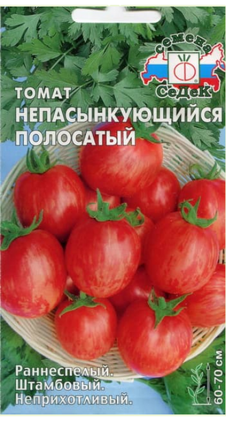 Раннеспелый (95-100 дней) сорт для открытого грунта и пленочных укрытий. Растение детерминантное, высотой 60-70см, штамбовое. Не требует обязательного пасынкования. Плоды овальные, малиновые с тонкими желтыми полосками, среднеплотные, массой 70-80 г, мясистые, отличного вкуса. Ценность сорта: сочетание раннеспелости и высокой урожайности, декоративность. Рекомендуется для свежего использования, цельноплодного консервирования, переработки на томатопродукты.