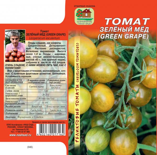 Ветвление выраженное. Плоды шаровидные, спелые зелено-бронзовые, массой 40 г, как крупные черри. Очень сладкие, с ними можно пить чай, как с конфетами!
