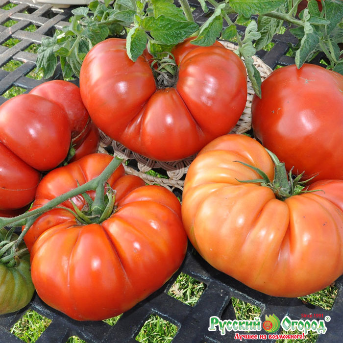 В серии полюбившихся всем биф-томатов ещё один мощный и брутальный гигант-красавец. Плоды плоско-округлой формы, сильно ребристые, многокамерные, массой почти в 1 кг, красивой ярко-красной окраски, без пятна у плодоножки.